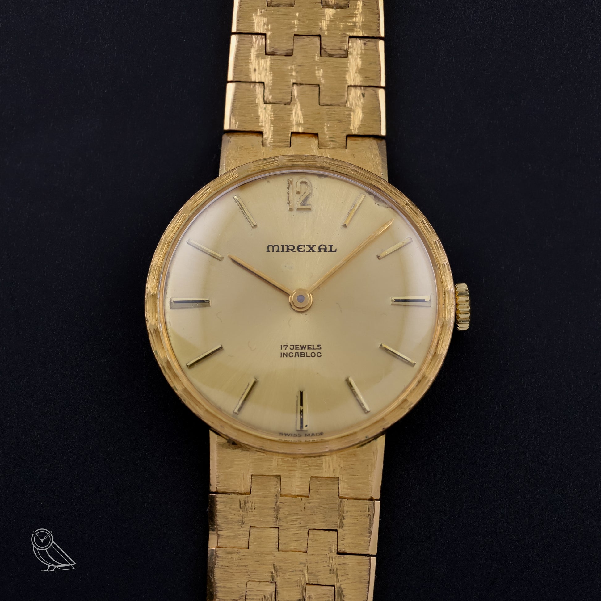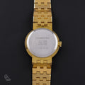 The classic 70s look is presented in a solid gold finish. The slim, round case features a textured, gold-plated bracelet, a champagne-colored dial with applied indices and an Arabic numeral 12, and gold baton hands. The reliable Swiss hand-wound movement with Incabloc shock protection is practical and easy to use every day.
