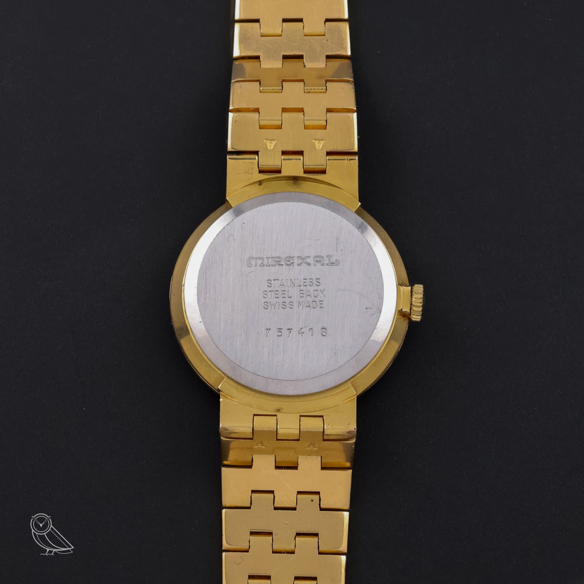 Case: gold-plated, pressed stainless steel case back with engraving "Swiss Made"