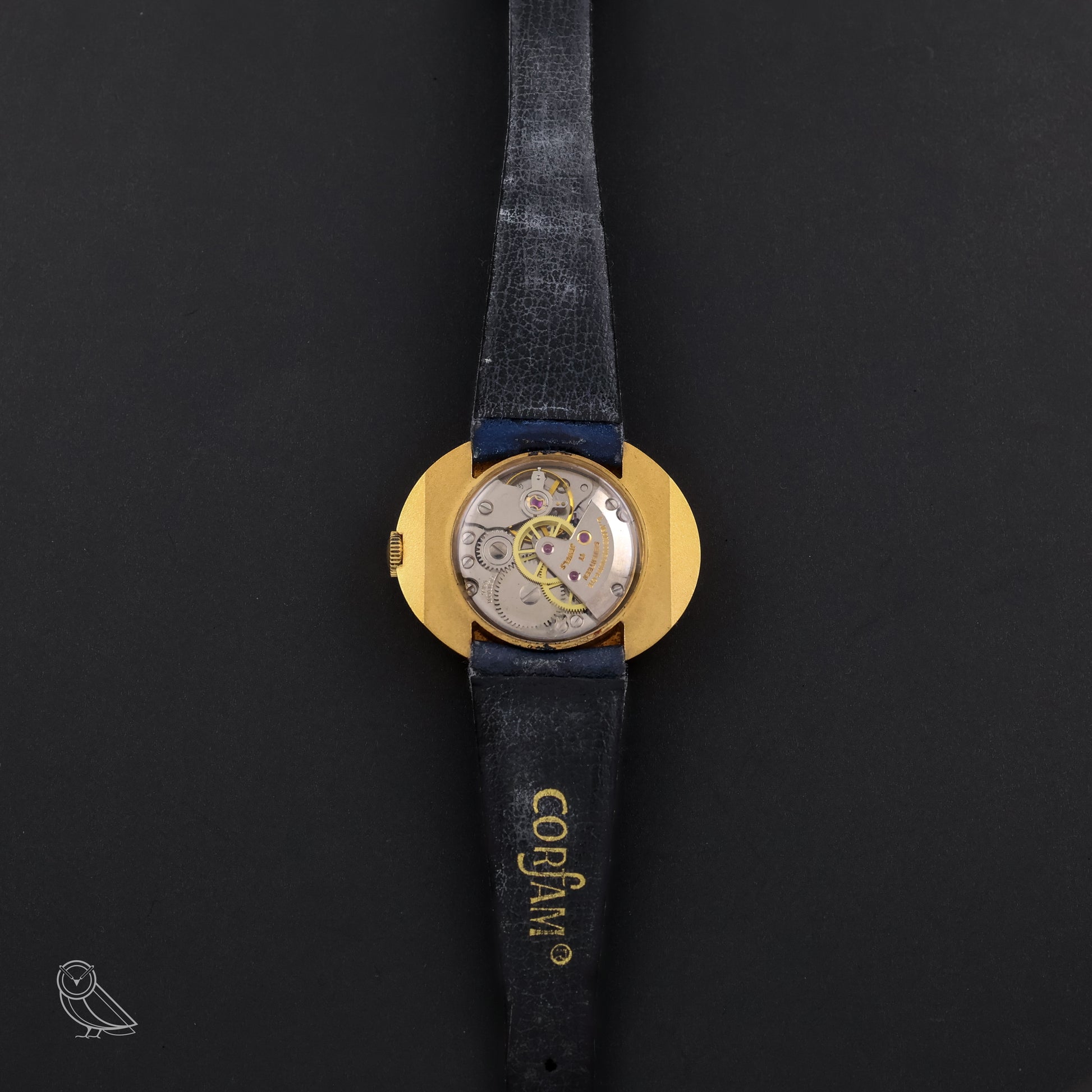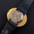 Eine Uhr, die man nicht vergisst. Die Chandler Starlike kombiniert ein ufoartiges Kissen-Gehäuse mit einem hypnotischen Mystery Dial. Im Zentrum dreht sich ein sternförmiges Scheibenmotiv, während Minuten und Stunden über rot markierte Segmente abgelesen werden. Das sorgt im Lauf für einen Moiré-Effekt, der je nach Licht ständig anders wirkt. Die 32 mm grosse Front trägt sich kompakt, das Gehäuse hat eine weich satinierte Goldton-Oberfläche. Auf der Rückseite befindet sich ein Sichtfenster, das einen Blick auf das Handaufzugswerk mit 17 Steinen ermöglicht - ein schönes Detail, das bei Modellen dieser Ära selten zu sehen ist.