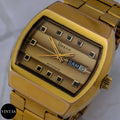Das 38-mm-Gehäuse bietet eine angenehme Präsenz am Handgelenk, während das gebogene, goldene Zifferblatt mit schwarzen quadratischen Indizes und der Tages- und Datumsanzeige eine zeitlose Eleganz ausstrahlt. Angetrieben von einem präzisen Automatikwerk ist diese Uhr nicht nur stilvoll, sondern auch technisch beeindruckend.