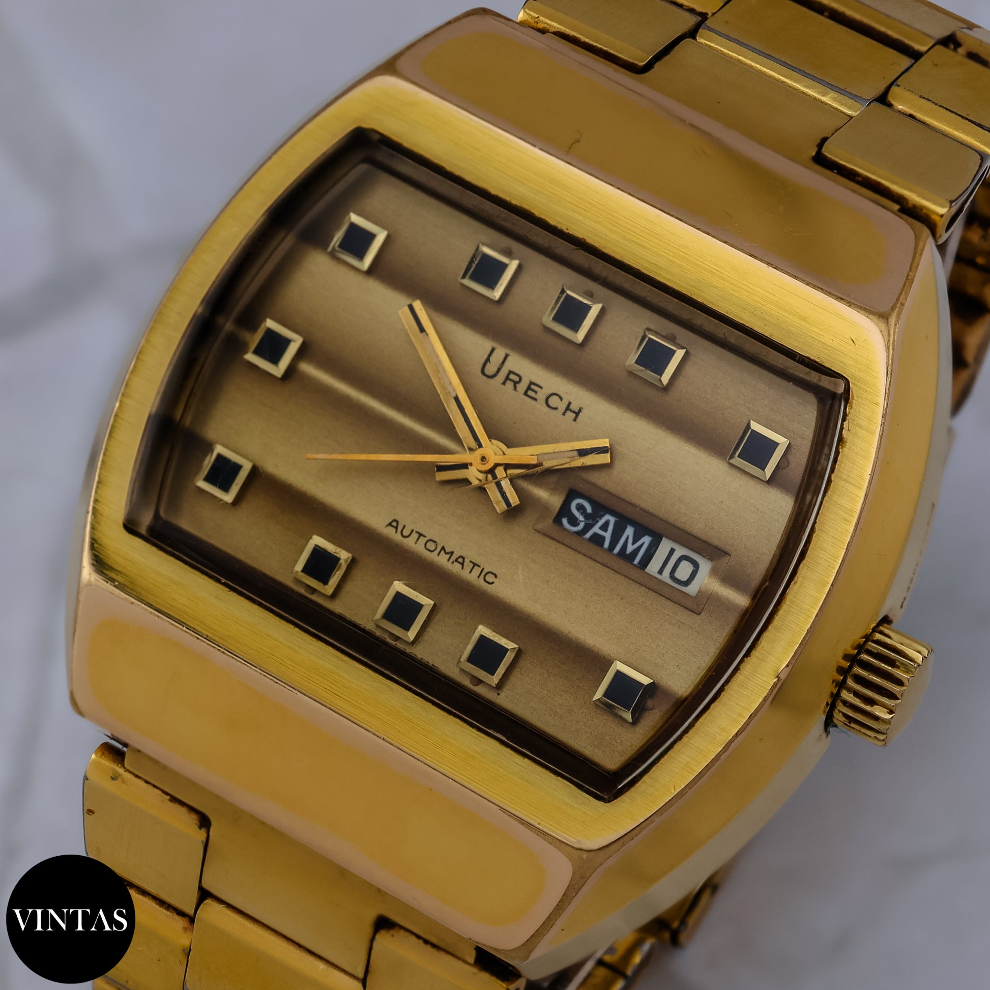 Die Urech Automatic ist ein prägnantes Statement aus den 1970er-Jahren und vereint markantes Design mit zuverlässiger Schweizer Uhrmacherkunst. Mit ihrem goldfarbenen Gehäuse und den auffälligen Details auf dem Zifferblatt ist diese Uhr ein wahres Highlight für Liebhaber von Vintage-Accessoires.